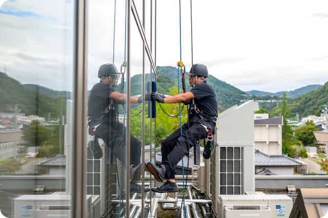 ロープやゴンドラを駆使し、手の届かない難所の汚れもプロの技術で美しく蘇らせます。